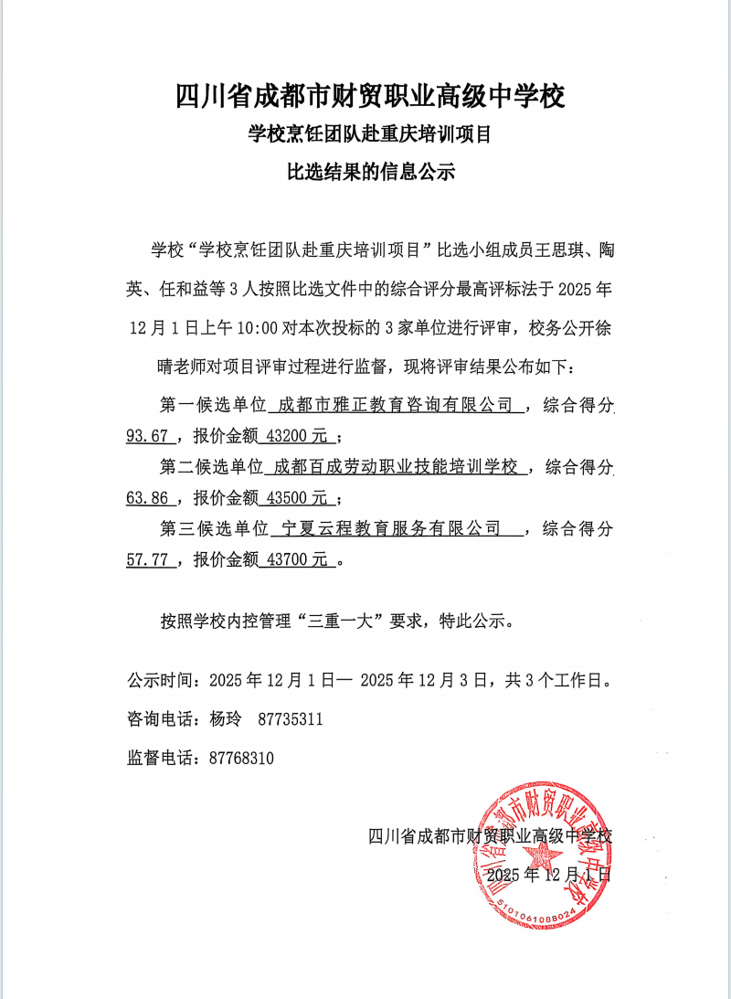学校烹饪团队赴重庆培训项目 比选结果的信息公示